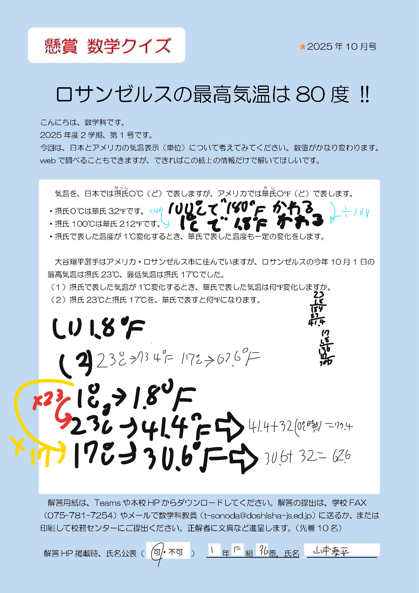 このことを理解すると、摂氏17℃と摂氏23℃を華氏で表すことは簡単だったのではないでしょうか。が、日常生活で使い慣れていない単位で考えることが意外に難しいことにも気づく問題だなと思い、出題しました。