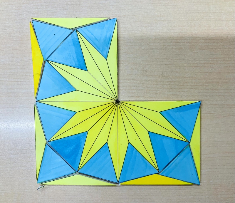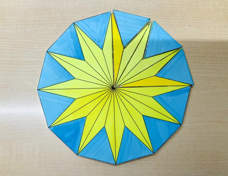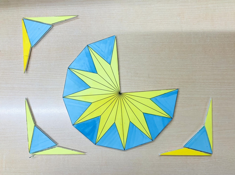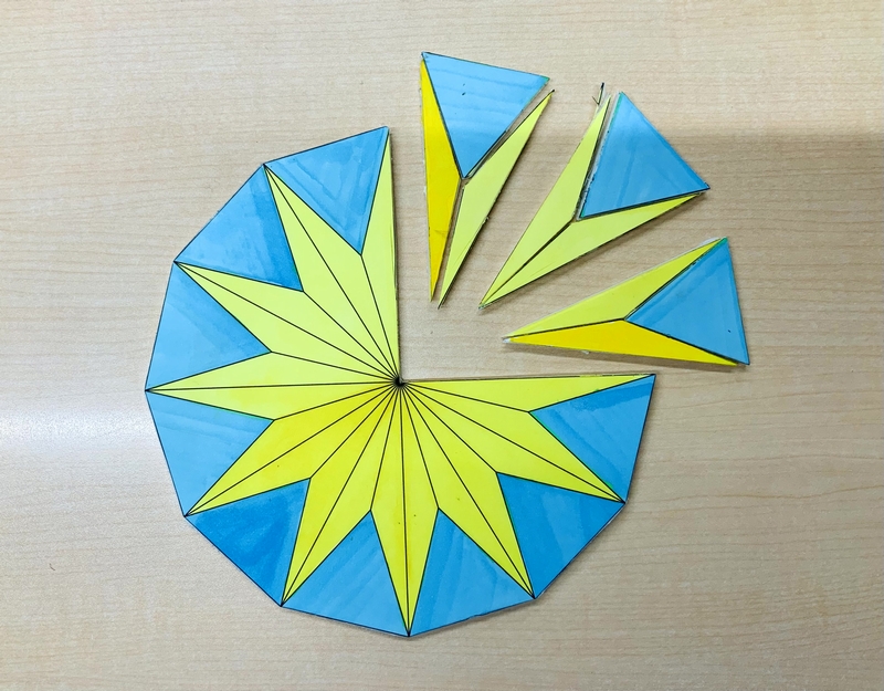 数井さんが制作された正12角形は発泡スチロールに紙を貼り、着色されています。正三角形(青)と底角15°の二等辺三角形(黄)を組み替えると、長さ「r」の正方形3つになります。4枚の連続写真をご覧ください。