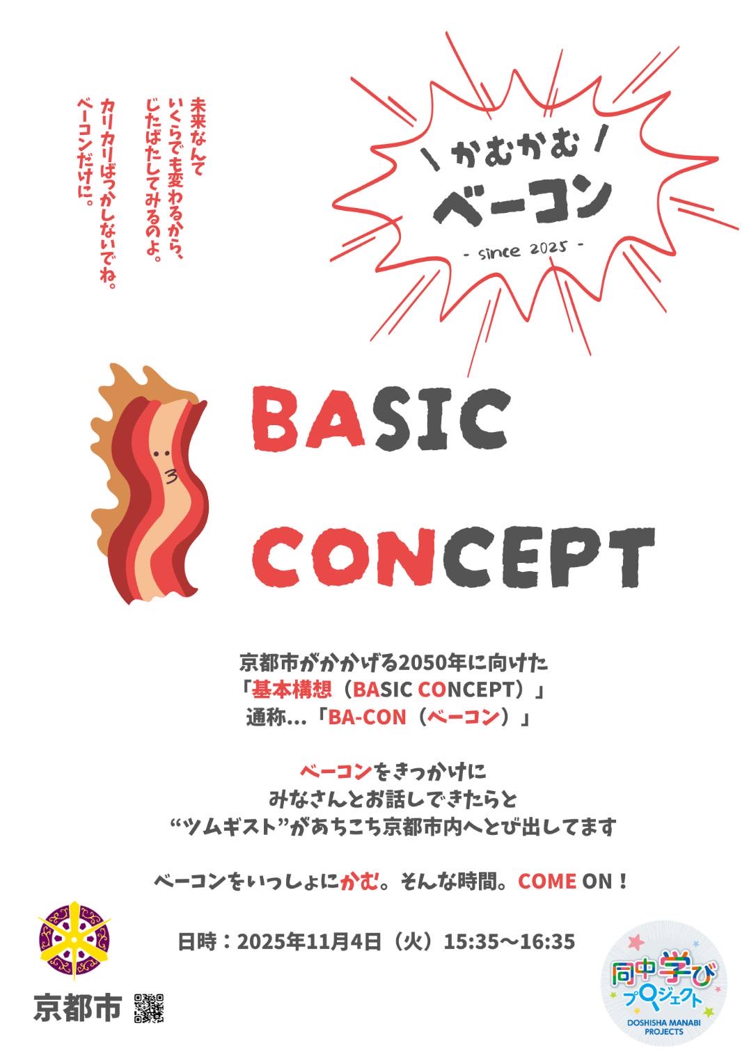 11月4日(火)、同志社中学校では「同中学びプロジェクト」として、京都市役所の小野寺さん(本校卒業生)、四方さん、大見謝さんをお招きし、「京都ベーコン(BASIC CONCEPT)」をテーマにした特別プログラムを実施します。京都市が2050年に向けて描く将来ビジョン=**「基本構想(BASIC CONCEPT)」は、未来の京都をどう育てていくかという“まちの羅針盤”です。その愛称「ベーコン(BA-CON)」に込められた思いをきっかけに、私たちは「自分とまちの関わり」を考えます。
