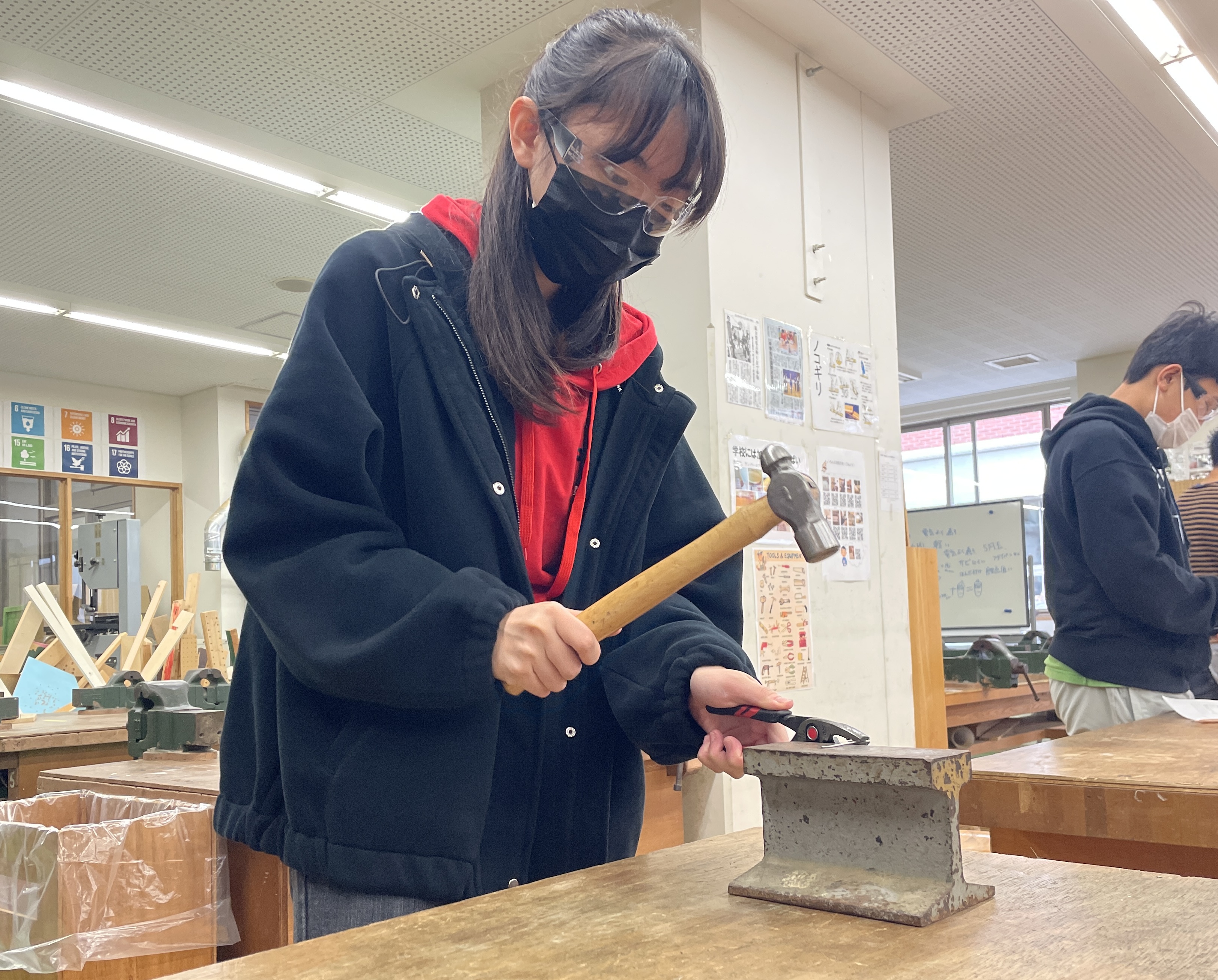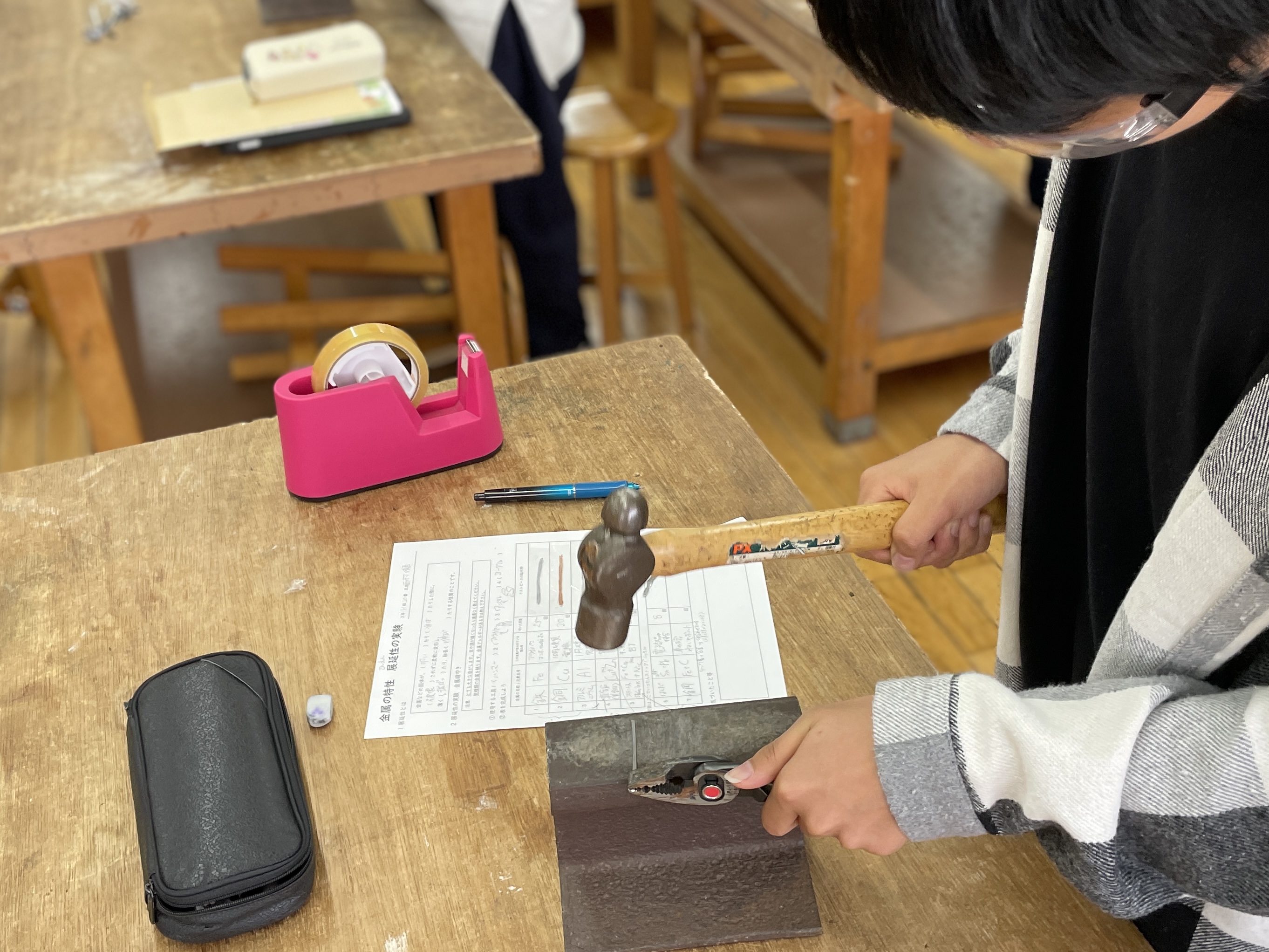 中学2年生の技術の授業で、7種類の針金をハンマーで叩き延ばすという活動を行っています。金属の展延性を身体で確かめるための、ささやかな実習です。