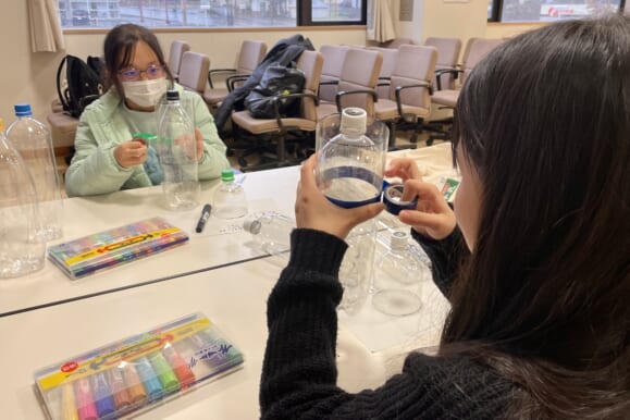 ワークショップでは、身近な素材を使ったペットボトルロケット製作しました。