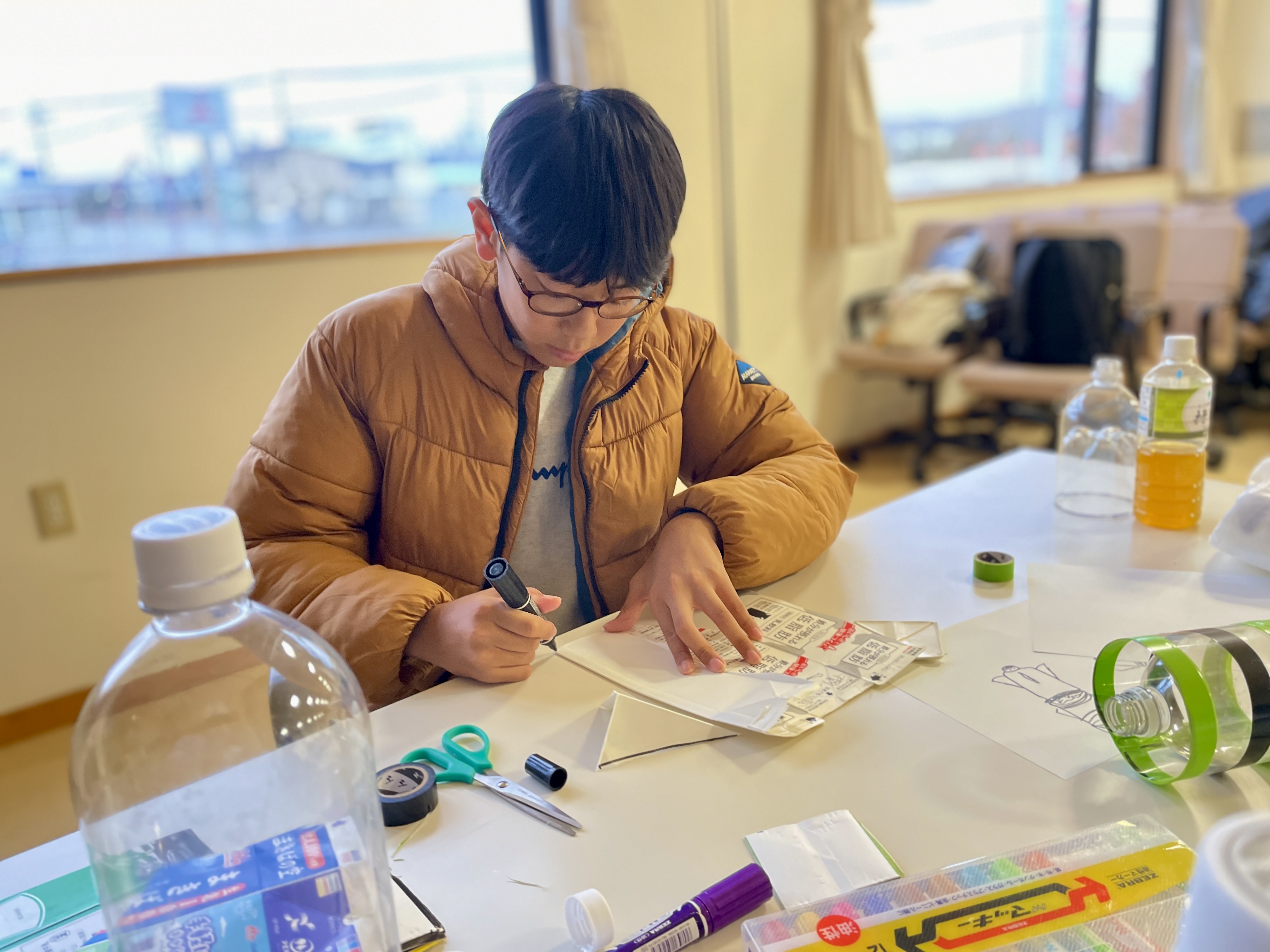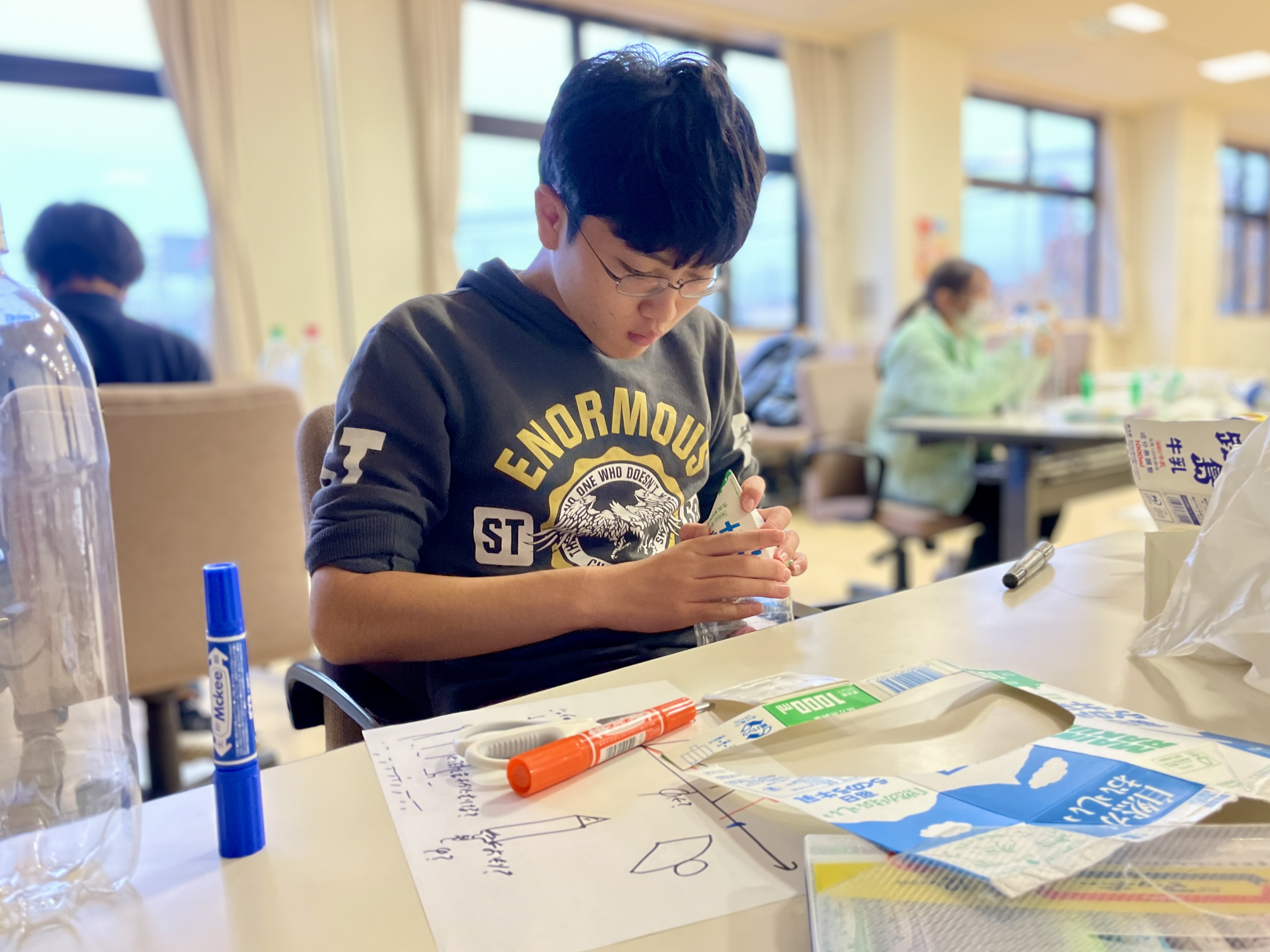 「より遠くへ、よりまっすぐに飛ばすには?」という問いをもとに、胴体の長さ、羽の角度、重りの位置など、様々なをパラメーターを自分で考え、試作を重ねます。風船と同じ「作用・反作用の原理」で飛ぶロケットというだけあって原理はとてもシンプルです。シンプルであるがゆえに難しさもあります。明日は打ち上げと改良を繰り返し、最適な設計を探ります。