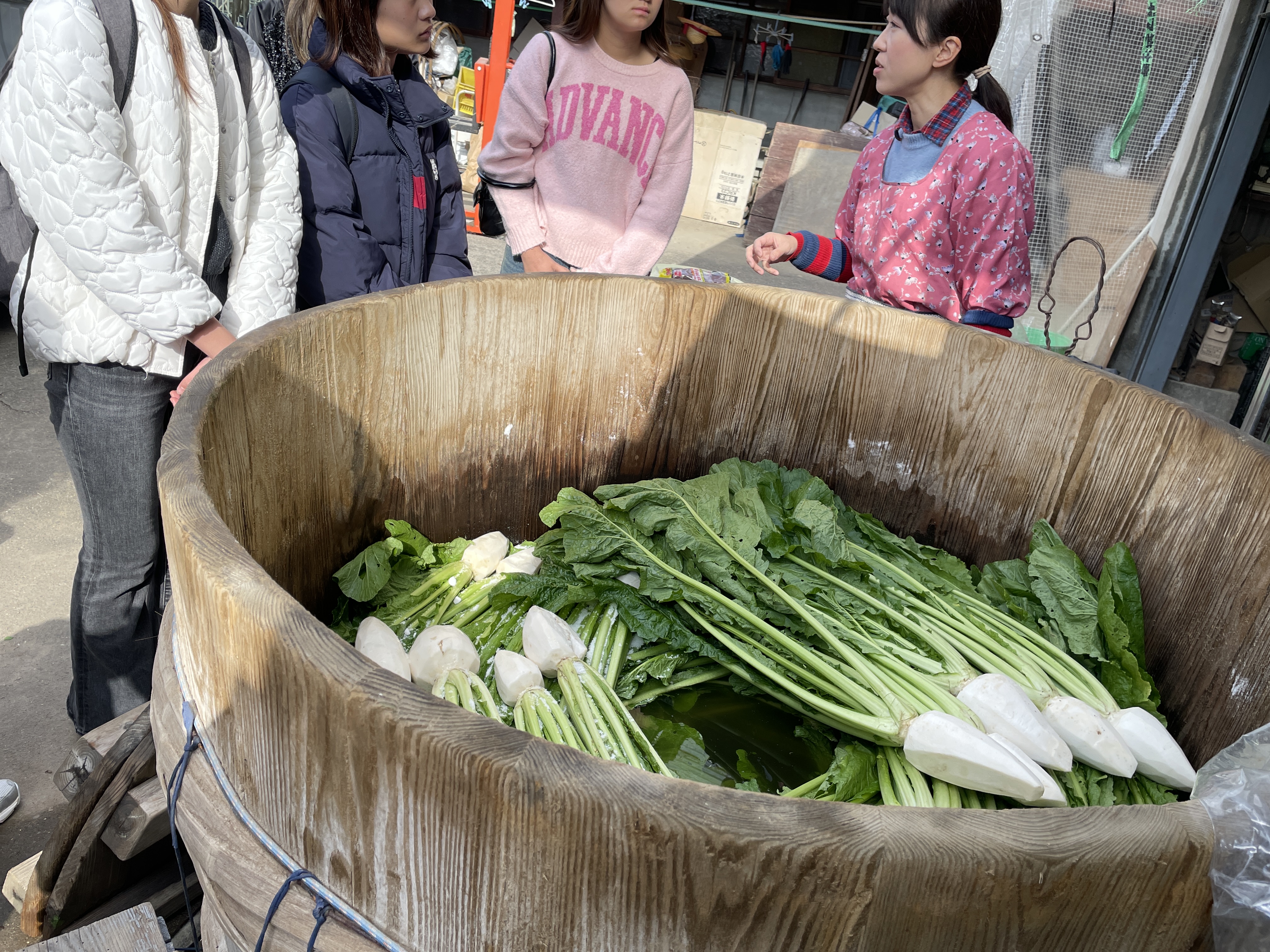 22日、6名の生徒とともに森田さんのすぐきの漬け込み作業を見学し、作業を体験させていただきました。今年は酷暑の影響で収穫が少し遅れているとのことでしたが、処理がおわったすぐきをいれる予定の室も見せていただきました。
