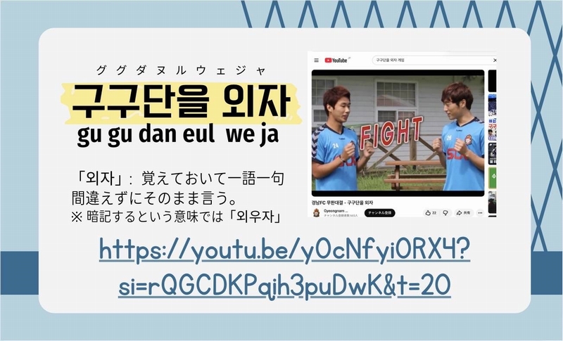 九九計算は、韓国でも、日本と同じように小学校で学習します。小学校の教室で使われていた掛け声をきっかけに「구구단을 외자(ググダヌルウェジャ)」という表現が広がり始め、1990年頃からは様々な場面でゲームとして活用されてきました。今日も、幅広い世代で楽しまれている遊びです。