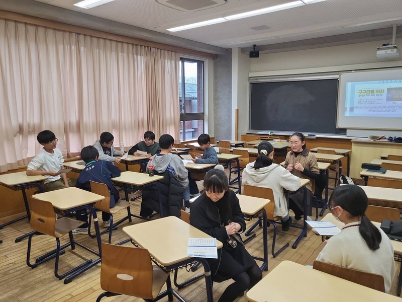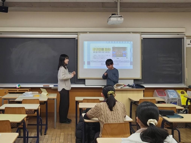 また、数日後に控えていた慶熙中学校との交流(1/24-26)を前に、韓国の学生たちとの会話に使える韓国語のフレーズもいくつか紹介しました。